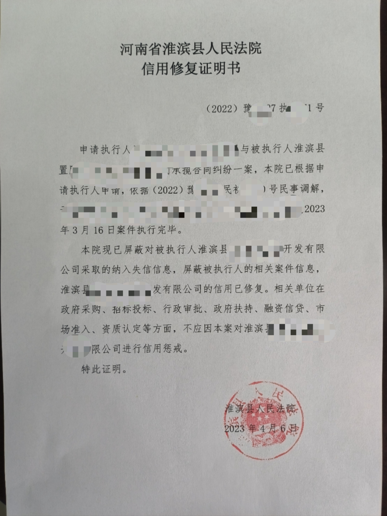 此时,该房地产开发有限公司负责人却向法官提出了一个请求,该公司近期将有较多商业活动,虽现已履行了义务,且法院屏蔽失信被执行人信息,但由于曾经有过失信记录,担心会对企业生产经营产生不利影响。得知企业的担忧后,淮滨县法院执行局经研究,认为该公司符合信用修复条件,依法向该公司出具《信用修复证明》,有了这份证明,被执行企业可以有效避免其再受到相关部门的信用惩戒措施,解决了企业的后顾之忧。