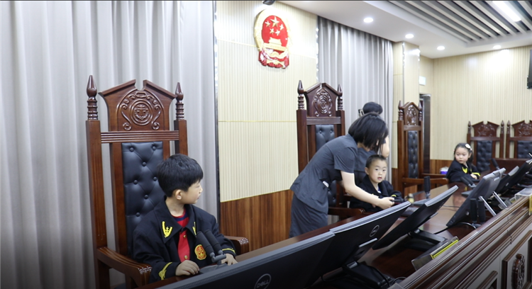 在模拟法庭,孩子们穿上法袍,坐上审判席,一边宣布“现在开庭”,一边敲响法槌,体验了一次当法官的感觉。