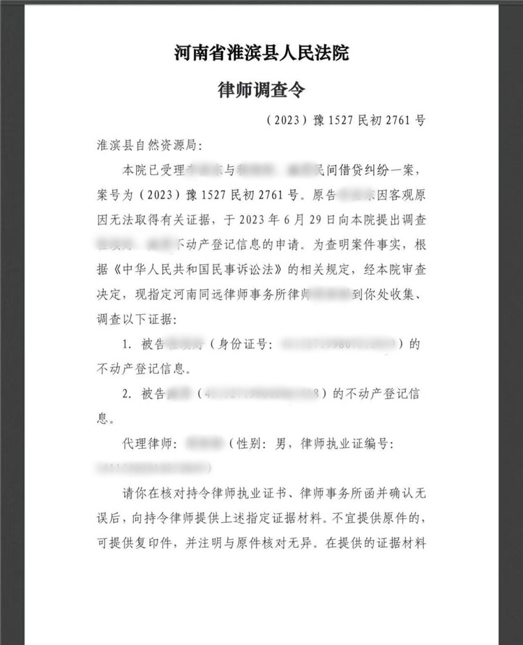2023年6月29日,淮滨县法院成功指导一起民间借贷纠纷案件,代理律师通过电子调查令线上查询不动产登记信息。案件承办法官在收到代理律师提交的调取涉案房屋产权登记信息申请后,通过电子送达方式向代理律师发送电子律师调查令,持令律师通过线上方式向淮滨县不动产登记中心查询相关信息,在完成相关信息核验后,即可接收查询信息。该案是淮滨县法院首例以电子律师调查令方式线上查询不动产登记信息的案件。