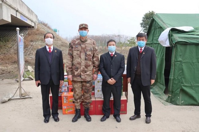 2月24日,淮滨法院党组书记张楷永一行来到新里镇陈围孜村疫情防控检查点,向奋战在防控一线的人武部官兵们致以诚挚的慰问,并送去了方便面、火腿肠、牛奶等慰问品。